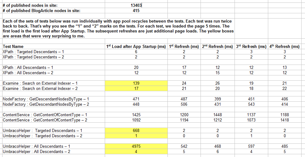 The first thing I noticed is that both the Examine and the UmbracoHelper Linq queries take a really long time the first time they are run. After that, they speed up quite a bit and even begin to perform a little faster than the UmbracoHelper XPath queries, but I'd like to know exactly what is happening to cause the slow first load of all of the data. It would be interesting to run these tests on a much larger site. I hope to blog again with more learnings.